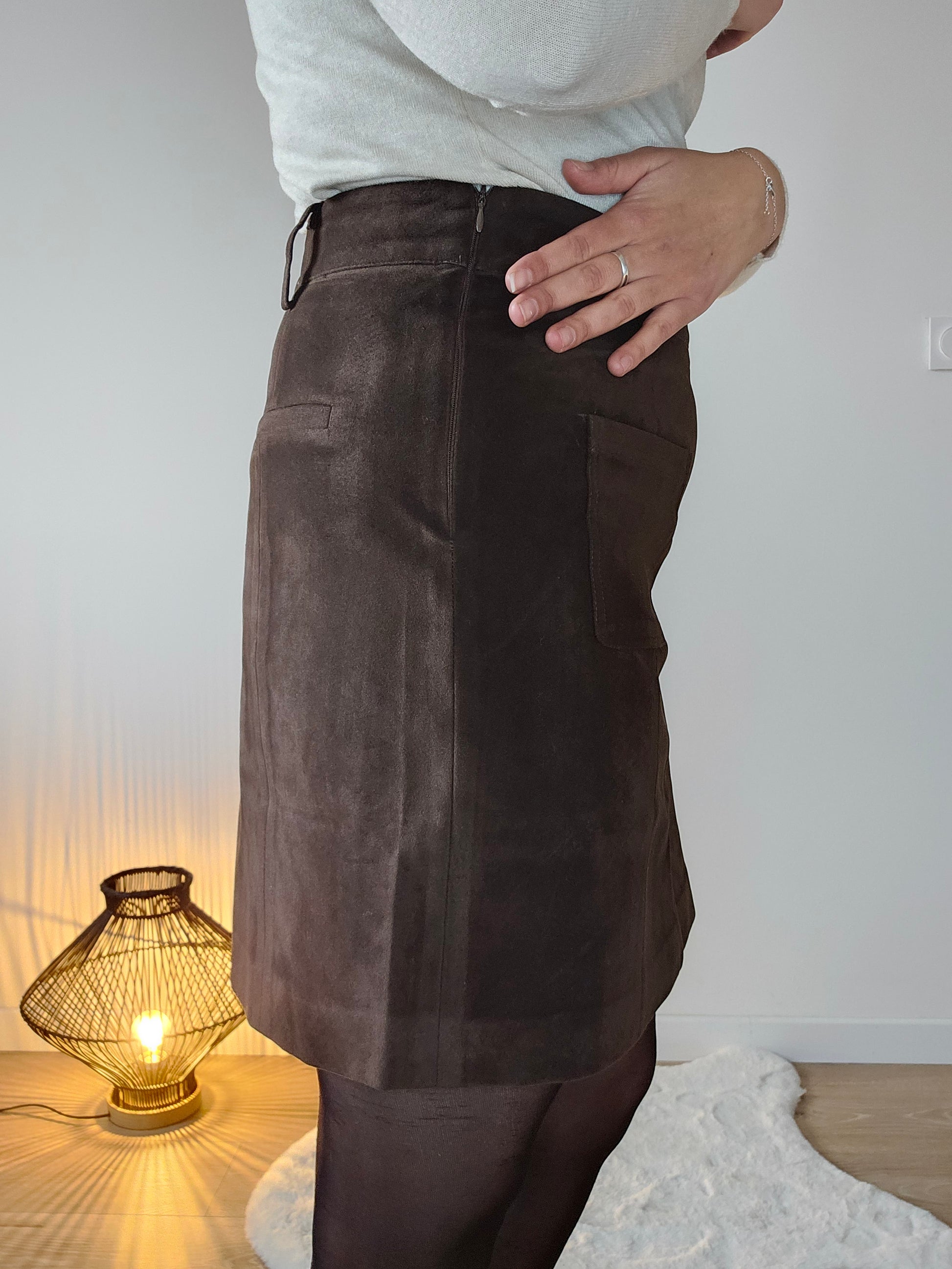 Jupe courte en suédine rigide aspect cuir vieilli.